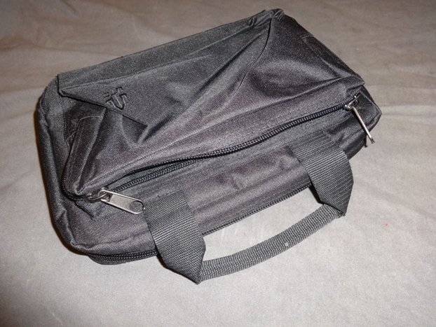 This medium sized, soft range case measures 14" x 10". It has a smaller outer zipper case and inside it has (6) large sized pistol magazine pouches and (2) narrower pouches. Also has (2) pistol compartments, 1 on each side, all enclosed with a sturdy zipper.**Out of Stock**